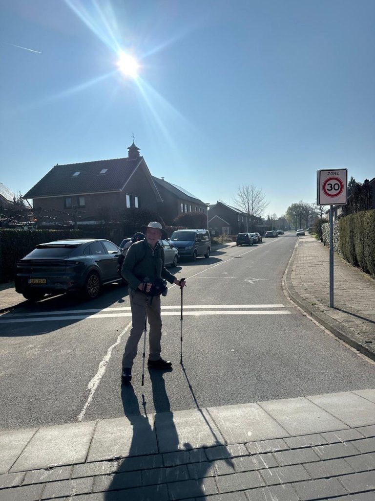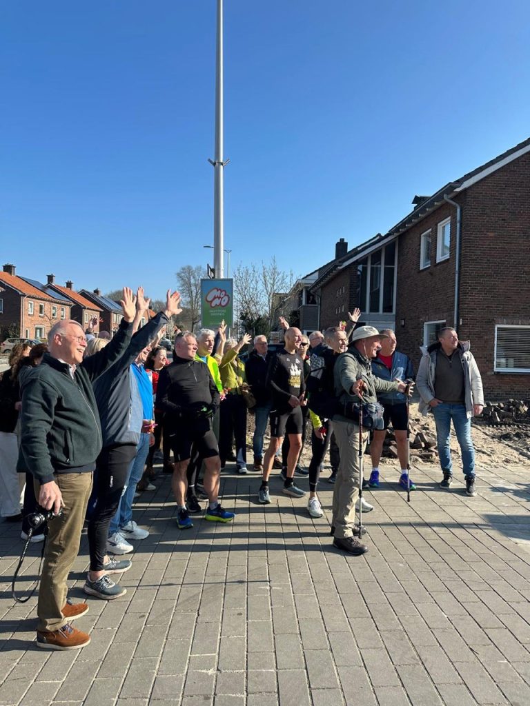 Vanmorgen om 9.30 vertrokken. En na de surprise party van vrijdag was het weer een spektakel. Ik had geen idee dat er zoveel vrienden en familie kwam om mij letterlijk uit te zwaaien. Ik had de vrijdagavond nog niet eens in mijn hoofd verwerkt en nu dit uitzwaaimoment. Ik weet nu al: dit wordt onvergetelijk. En dan feitelijk beginnen met lopen. Alles wat voorbereid is, wordt nu realiteit. Ik kan dat nog niet helemaal bevatten. Mijn dierbaarste schatten (Bertie, de kinderen en aanhang) hebben een afscheid georganiseerd dit weekend wat zo mooi en bijzonder is. De eerste kilometers voelden heel raar aan. Je loopt op ontzettend bekend terrein en je moet alles nog een plek geven. Toen ik langs de Plechelmus liep, begonnen de klokken te luiden. Ik dacht dat kan geen toeval zijn En dan Oldenzaal uit. Een van mijn hardloopvrienden (Marc) liep me tegemoet. Hij wilde zeker weten dat ik wegging. Maar vooral ook nog een foto van bordje einde Oldenzaal. Heel leuk van hem.