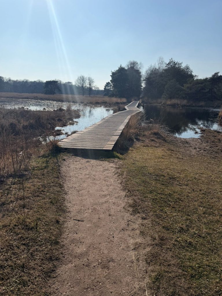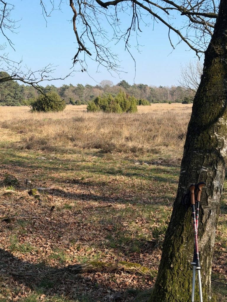 Over de Lonnekerberg naar Lonneker en dan door Roombeek (ook nog een foto van het monument) naar het centrum. Het weer was fantastisch. Dus toch even op een terrasje in Enschede voor een heerlijke koffie. En zowaar in Enschede een man die me een buen camino wenst. Na Enschede richting Rutbeek. Een tegemoetkomende fietser draaide zich om en liep een eindje mee over mijn motivatie om dit te doen. Hij had de schelp gezien. Hij had zelf ook al stukjes gelopen, maar sarria had hij door een blessure moeten afhaken. Hij vond het geweldig dat ik vanuit huis vertrok. Dat gaat hij ook doen……..als hij met pensioen is Daarna nog een wandelaar getroffen die mij vroeg of ik het trekvogelpad ging volgen. Dat had hij nu gedaan. Dit was zijn laatste etappe en was dus nu thuis. Hij vond het bijzonder dat dit dan mijn eerste etappe is. Na het Rutbeek door het Buurserzand. Dat is echt een heel mooi gebied. En met fantastisch weer natuurlijk een extra dimensie. Van mijn drie lagen kleding in de ochtend eindigde ik met slechts een laag.